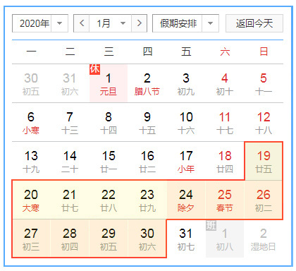 2020年1月19日(腊月廿五)至30日(正月初六),共放假12天,1月31日(正月初七)正式上班